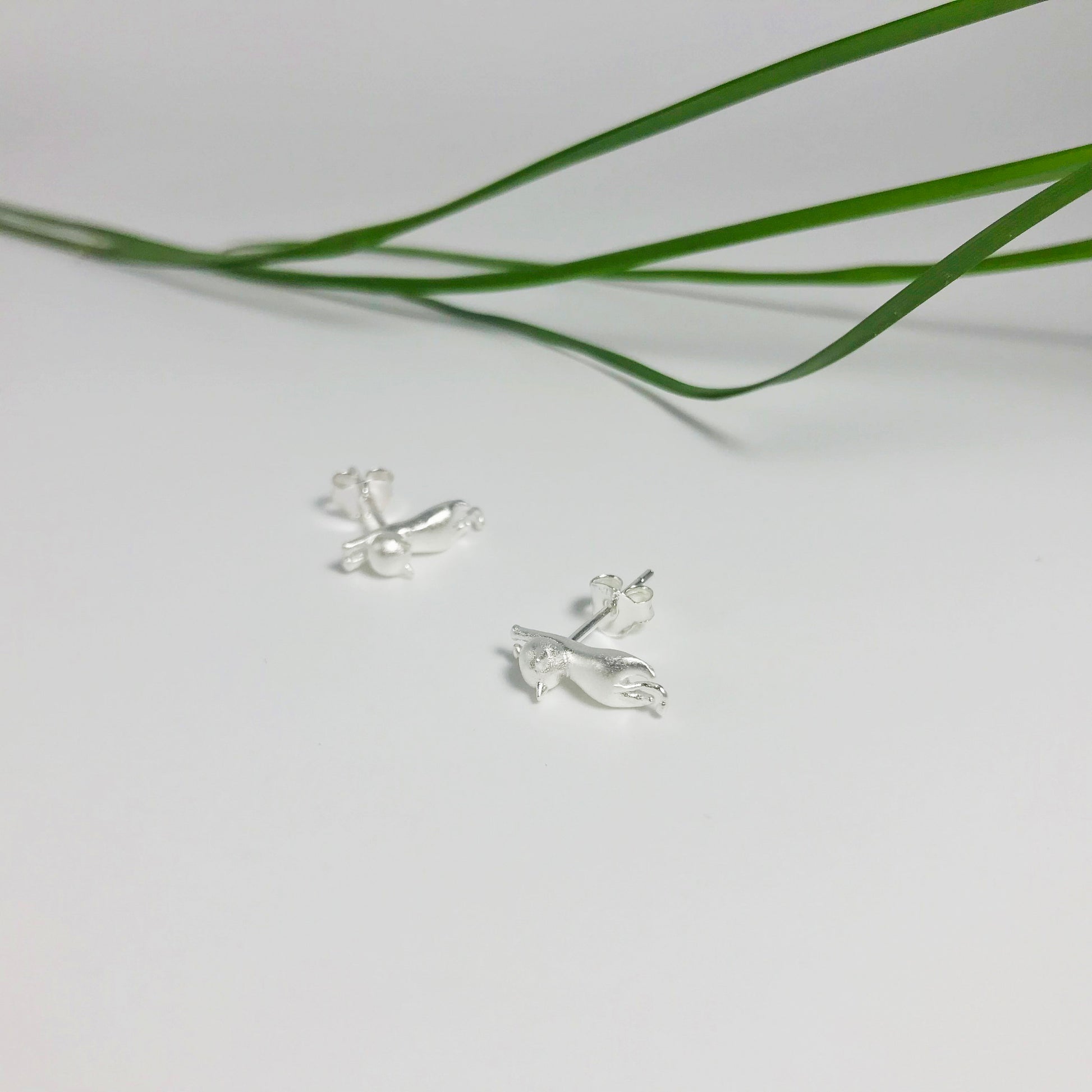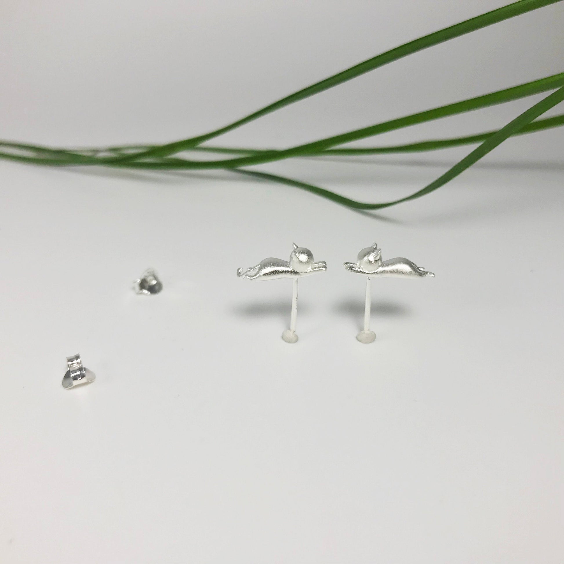 A sterling silver cat lies stretched (or leaping, hanging, or whatever your imagination tells you) as this stud earring. Dainty and unassuming, this is an affordable purchase for cat lovers of all ages! Part of a full matching set, with necklace (SNE1006), ring (SRI1003), and bracelet (SBR1018).