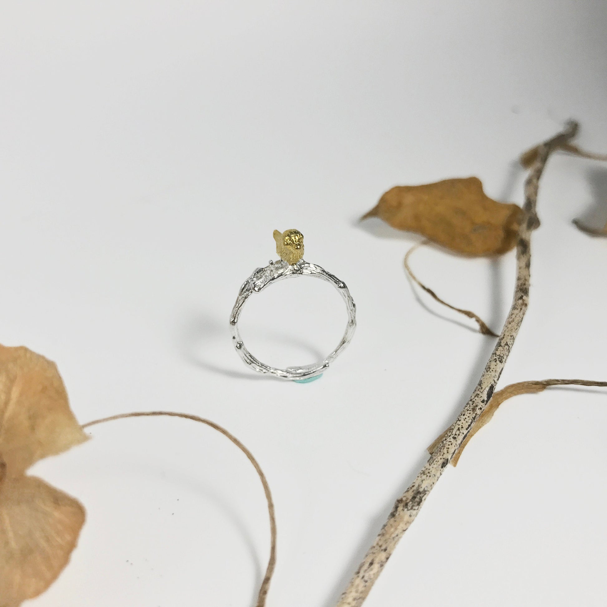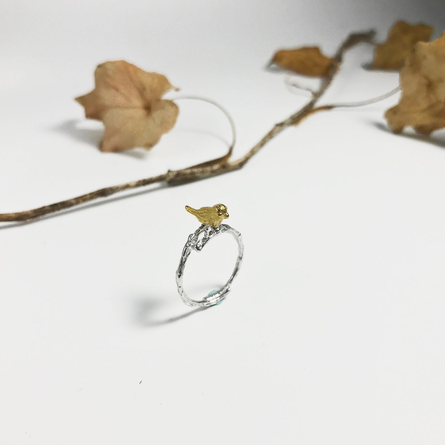 A gold plated songbird perches on a sterling silver branch that forms an adjustable ring.