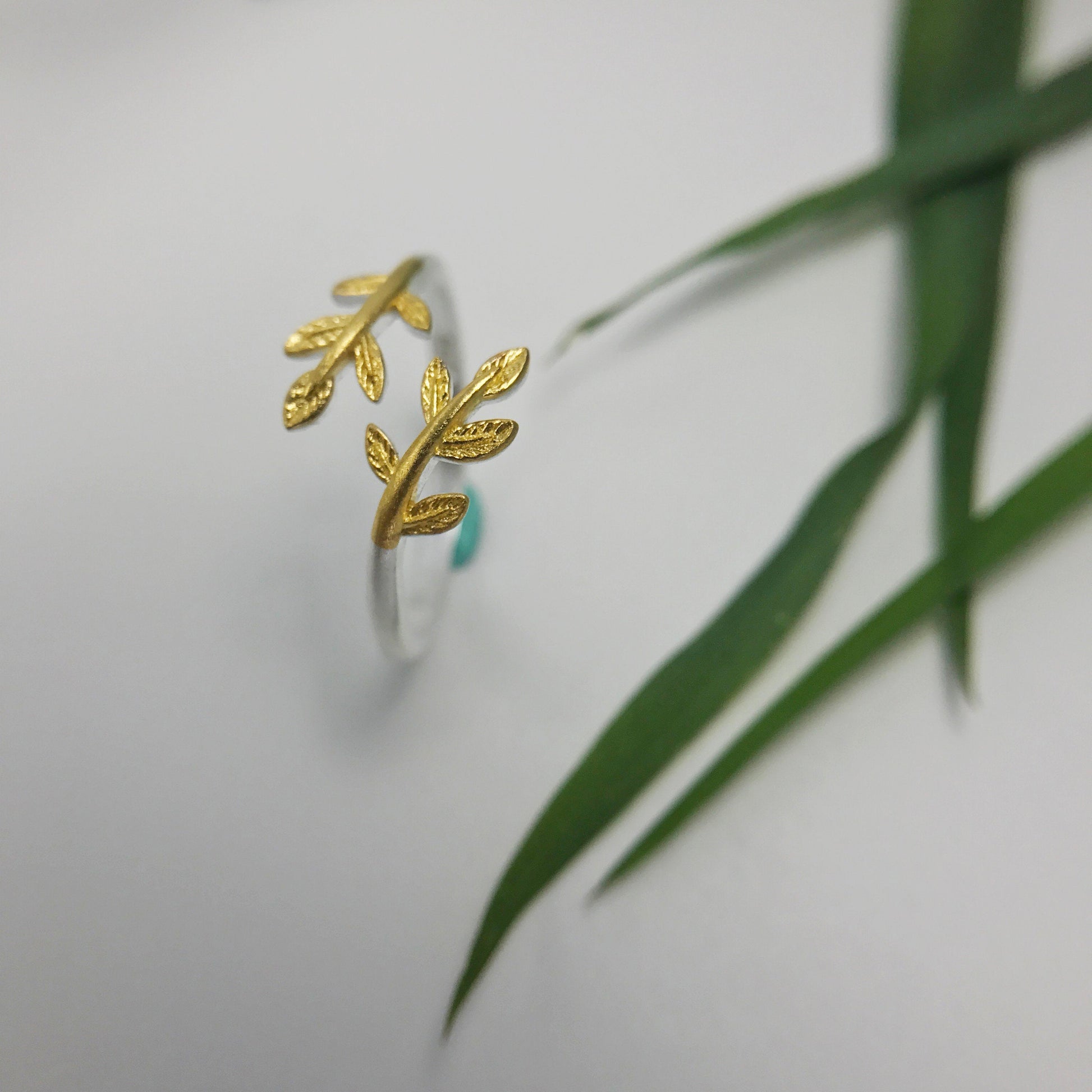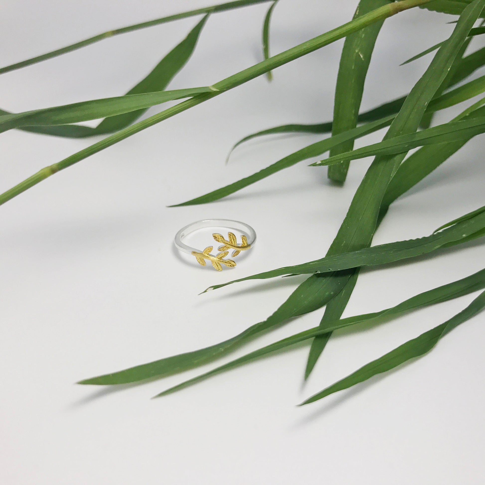 Two gold plated leafy twigs tip the end of this sterling silver adjustable ring, also available with a matching bracelet (SBR1012).