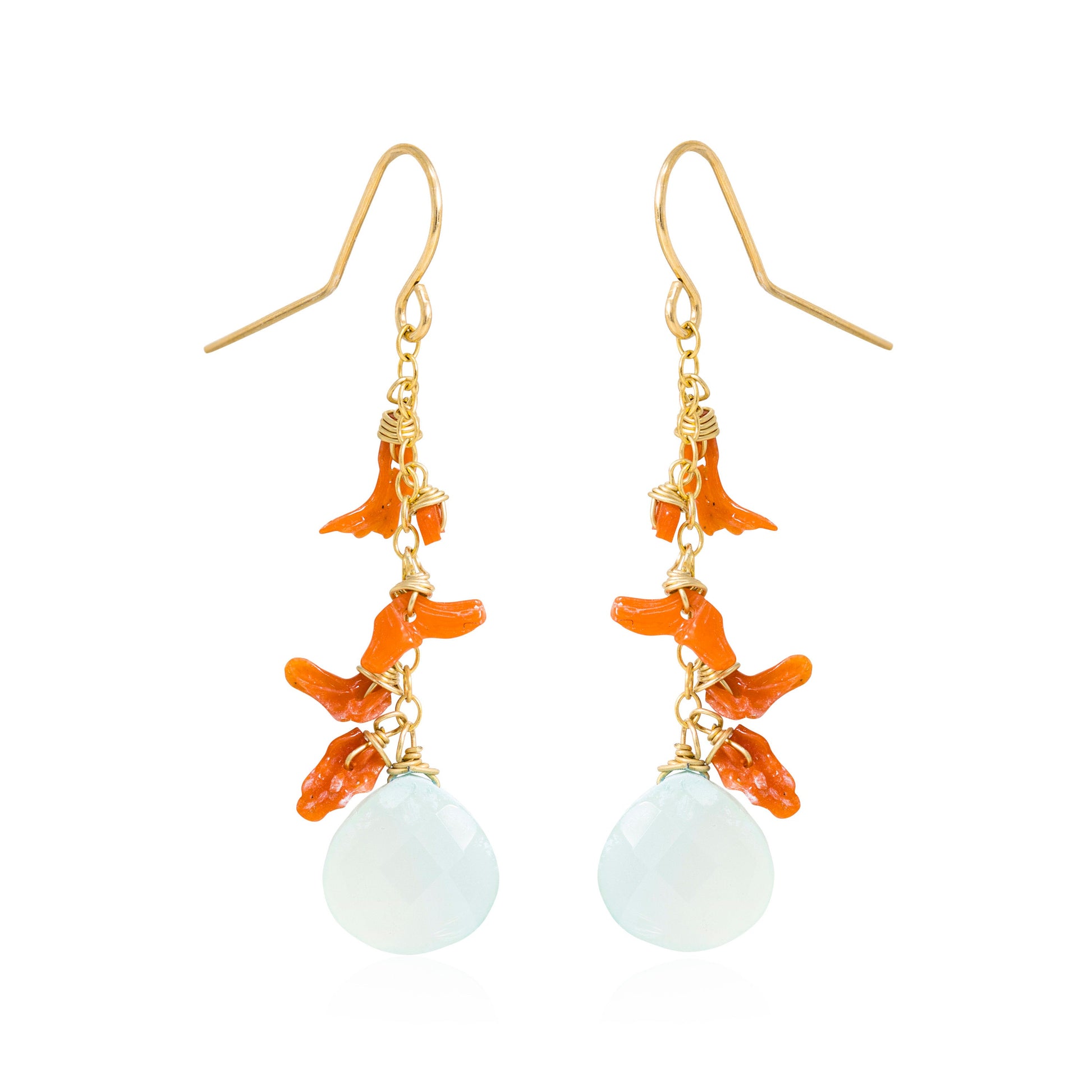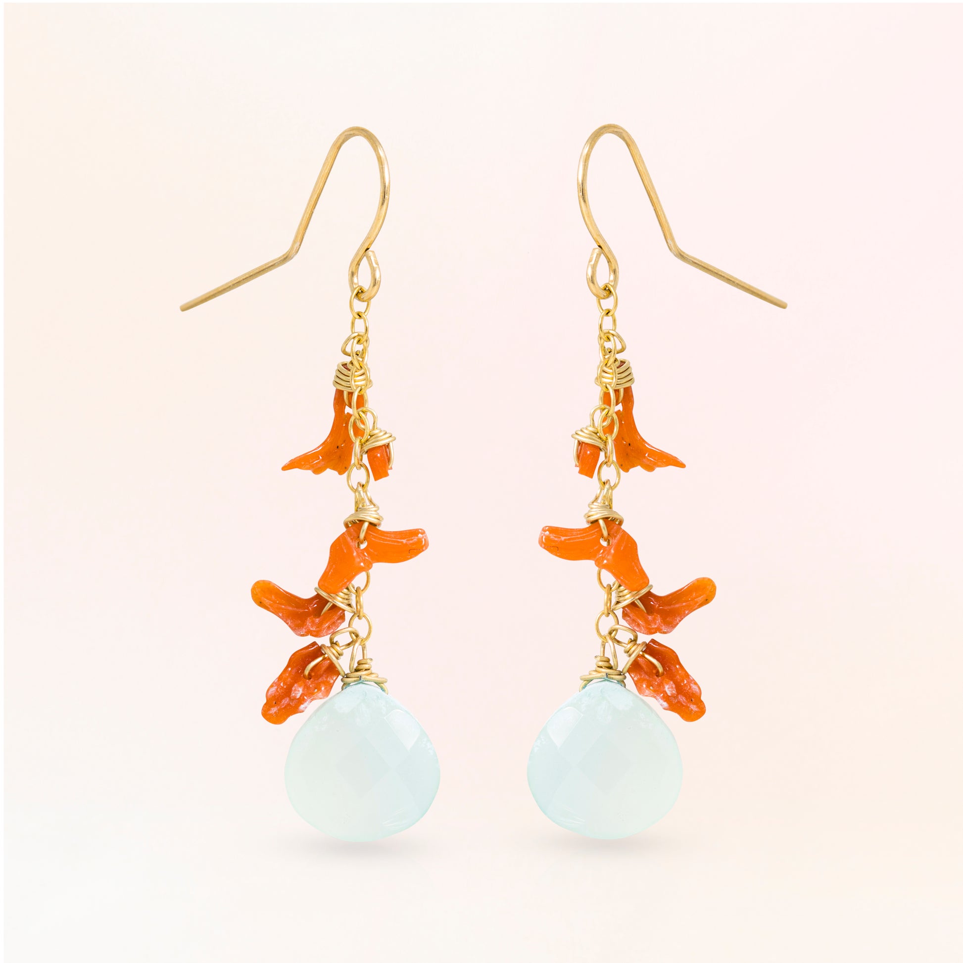 Handmade with 14k gold filled wire and chain holds beautiful Italian coral and chalcedony gemstones. These drop earrings are perfect for those who love unique dainty jewelry. The Italian coral is sustainably collected, and our use of coral is extremely limited. 1.8 inches long.
