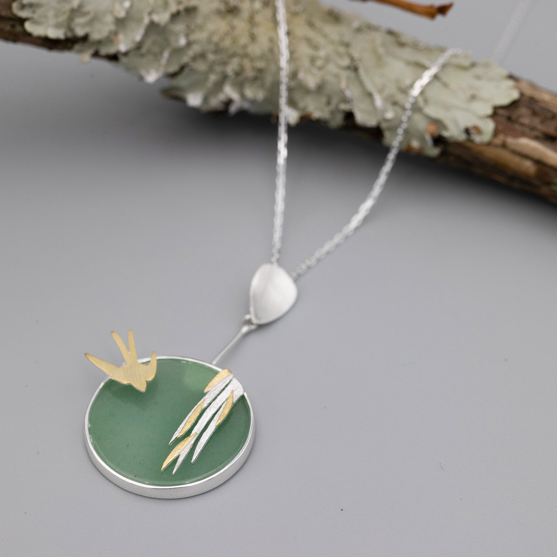 A circle of jade is featured in this sterling silver pendant, with a golden bird in this nature necklace design.