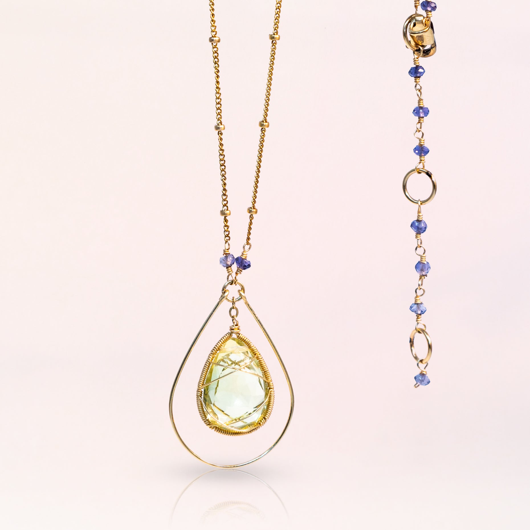 A faceted lemon quartz gemstone is wire wrapped with 14k gold fill wire to form this beautiful necklace. The large gemstone is accented with iolite beads. Perfect for those that love bold jewelry, this piece combines the several elements to make a beautiful addition to a statement jewelry collection. Adjustable between 16" and 18" with a gemstone accented chain.