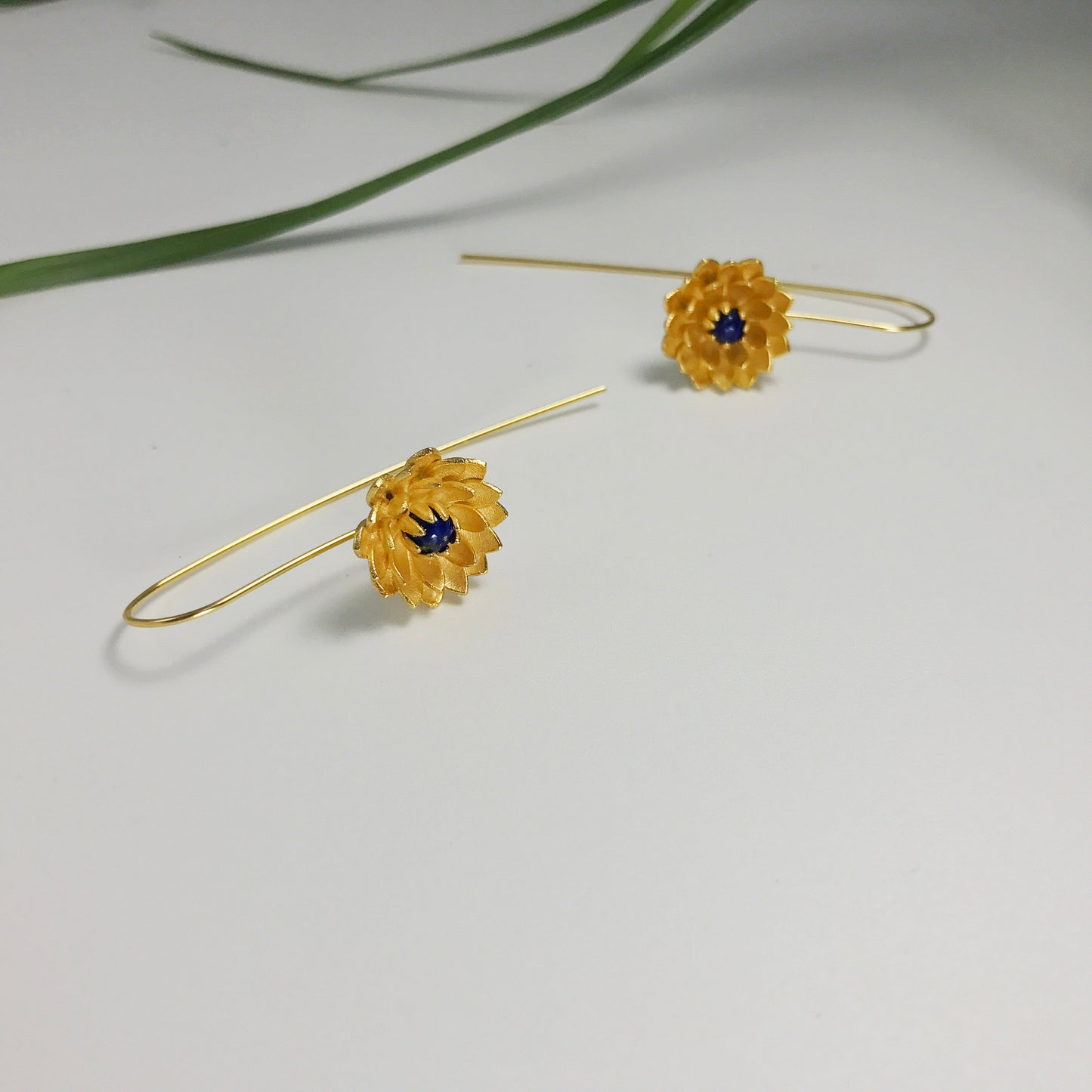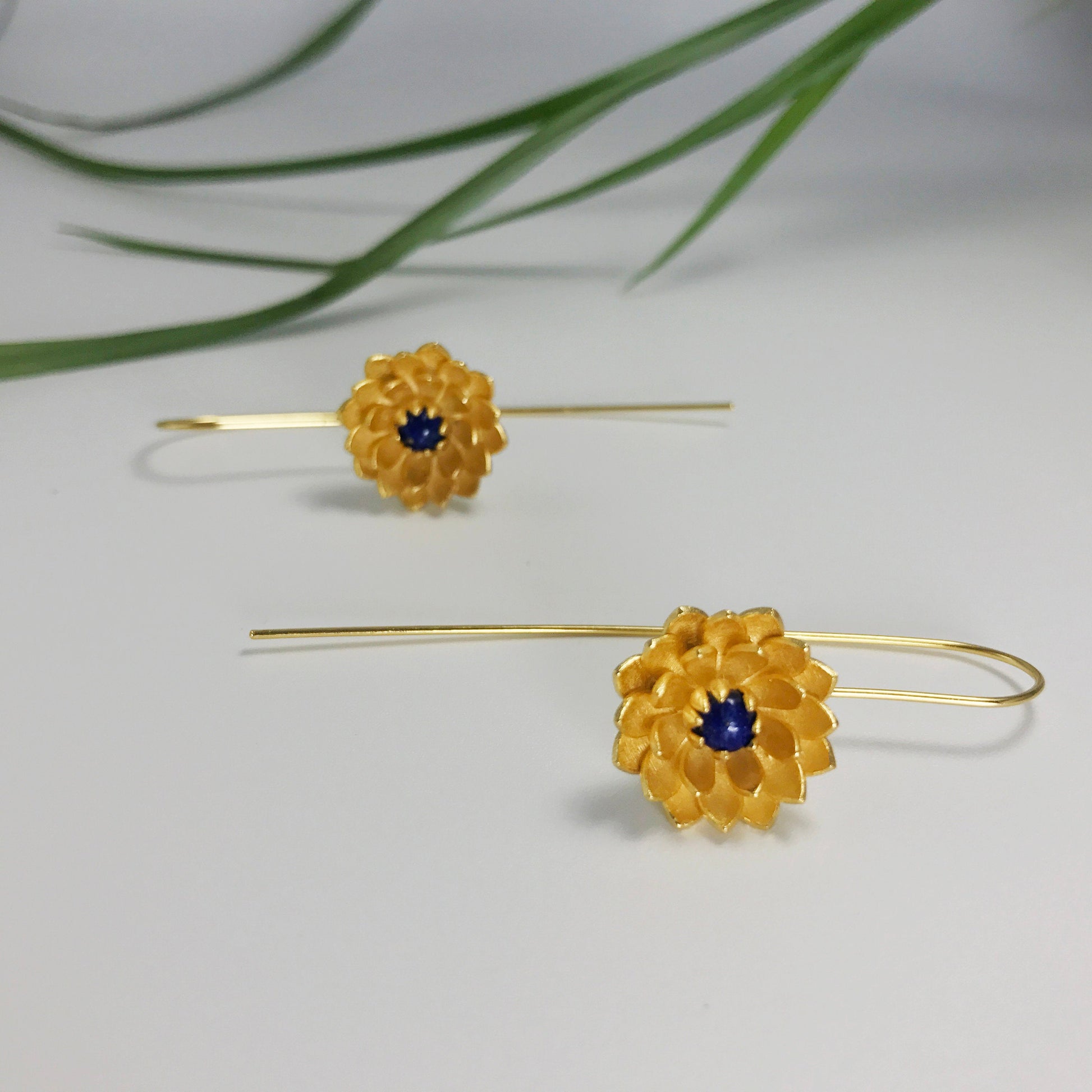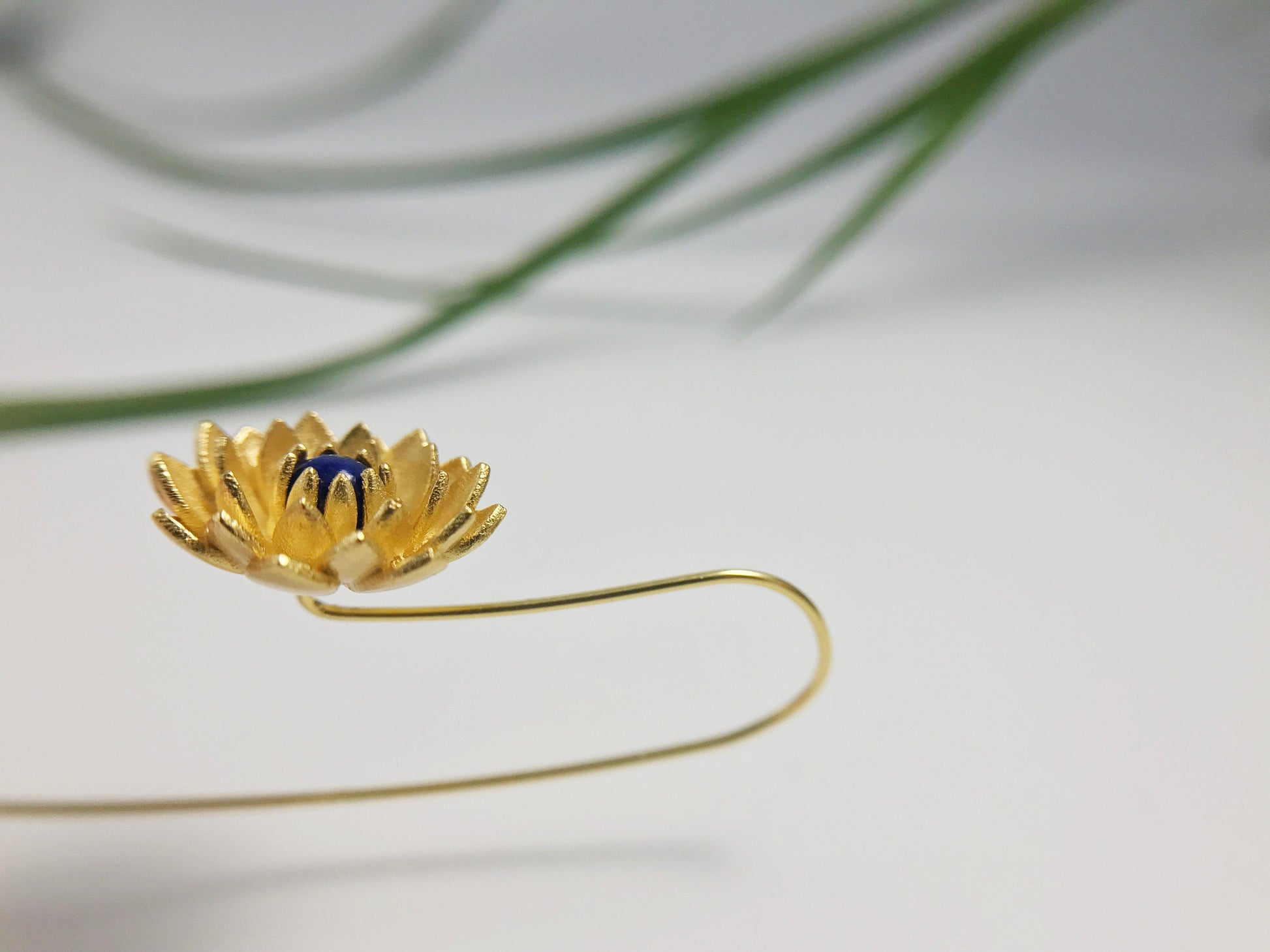 A gold vermeil sterling silver lotus with a lapis lazuli center hangs at the end of a long stem that loops through the ear and hangs off the back. This piece has always proven popular with customers.