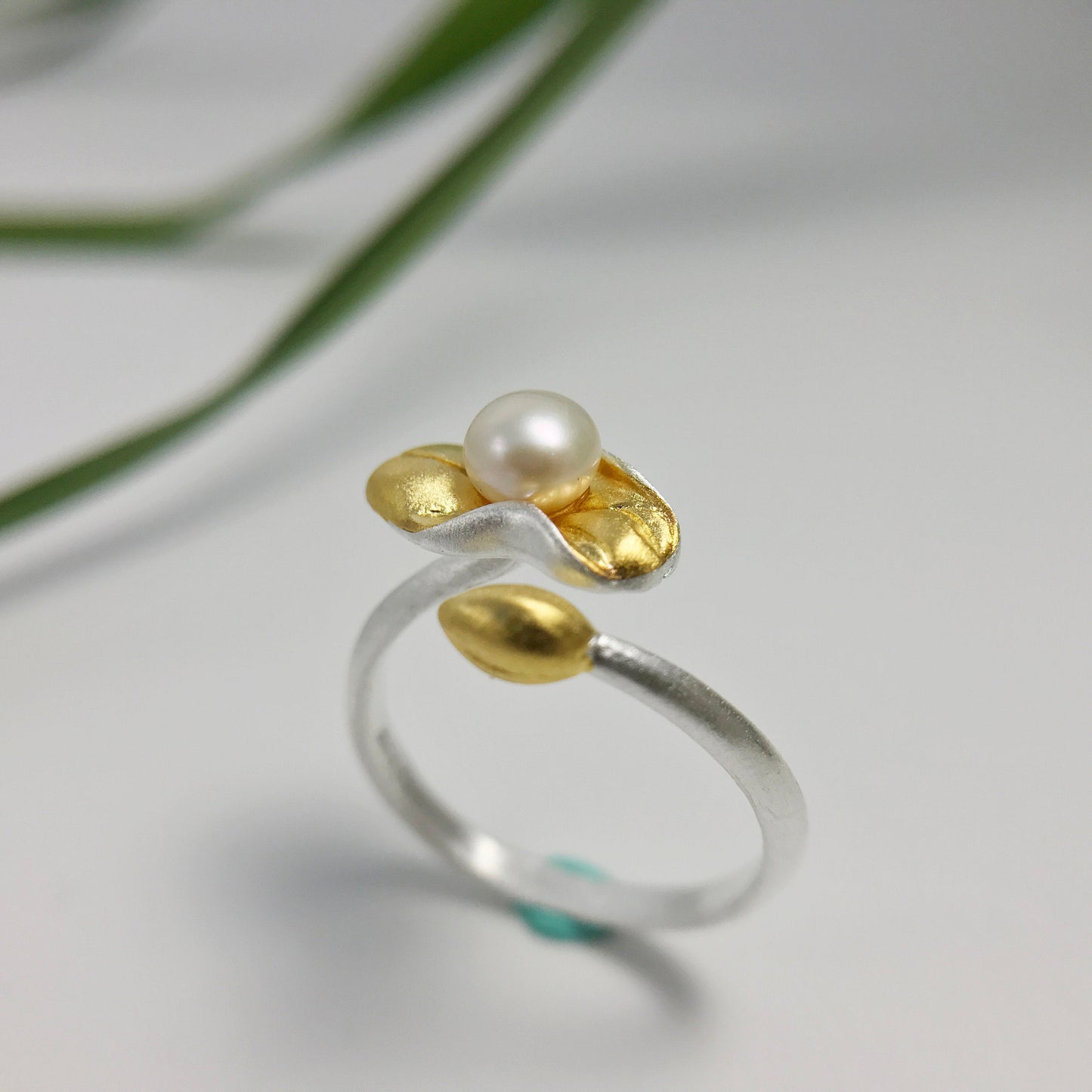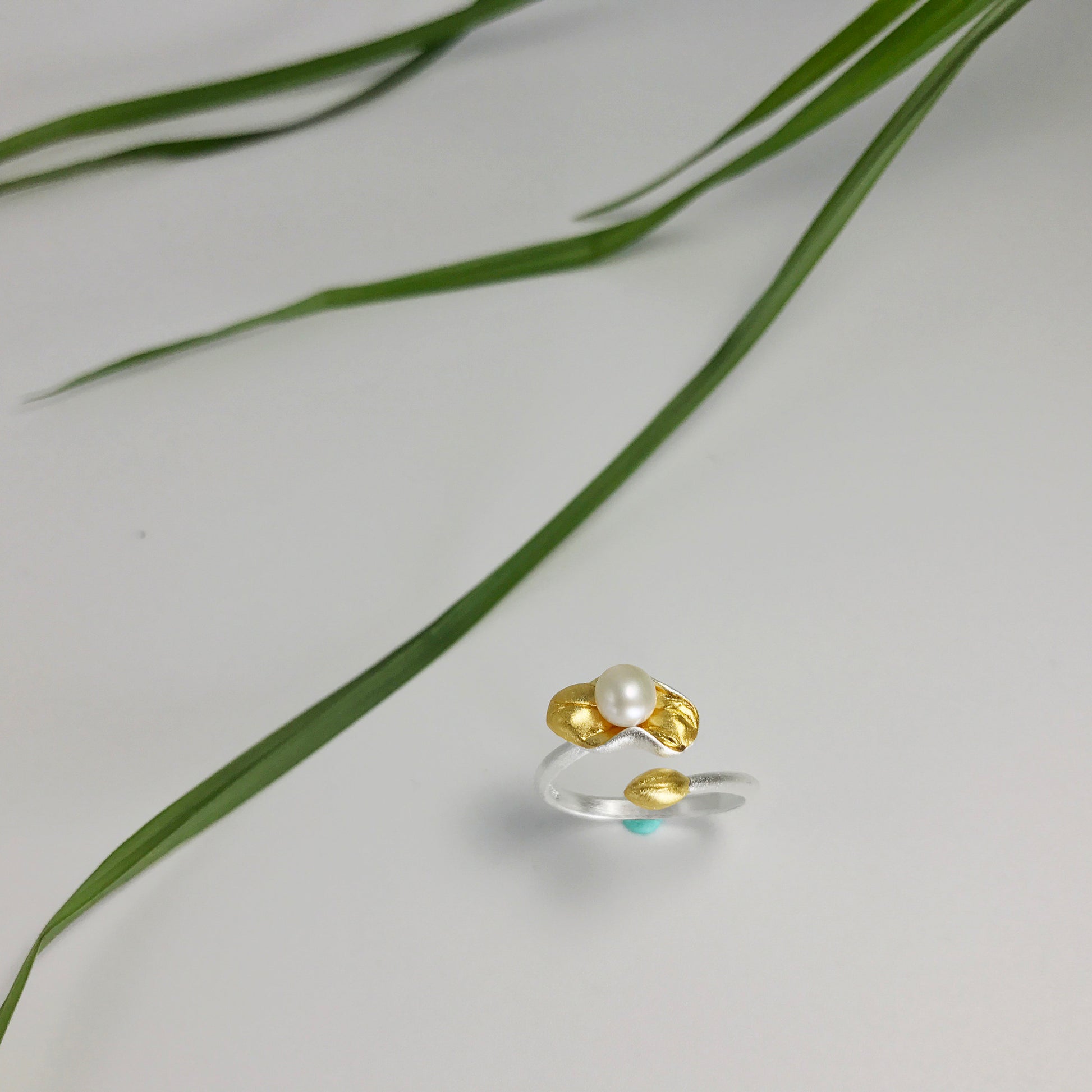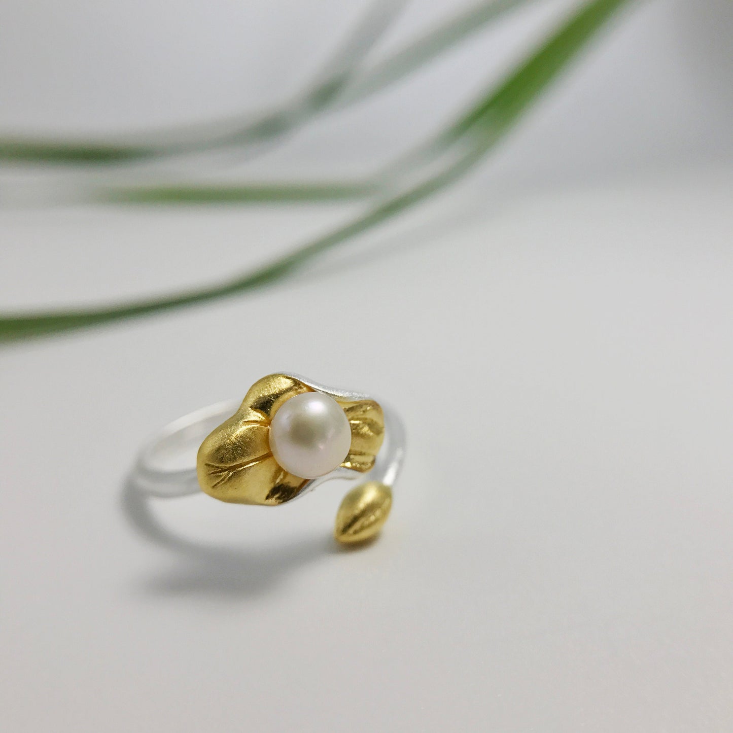 A gold plated lotus leaf and bud tip the ends of this adjustable sterling silver ring. The lotus leaf supports a small pearl. This particular ring is part of a set with matching earrings (SEA1033) and a bracelet (SBR1006).