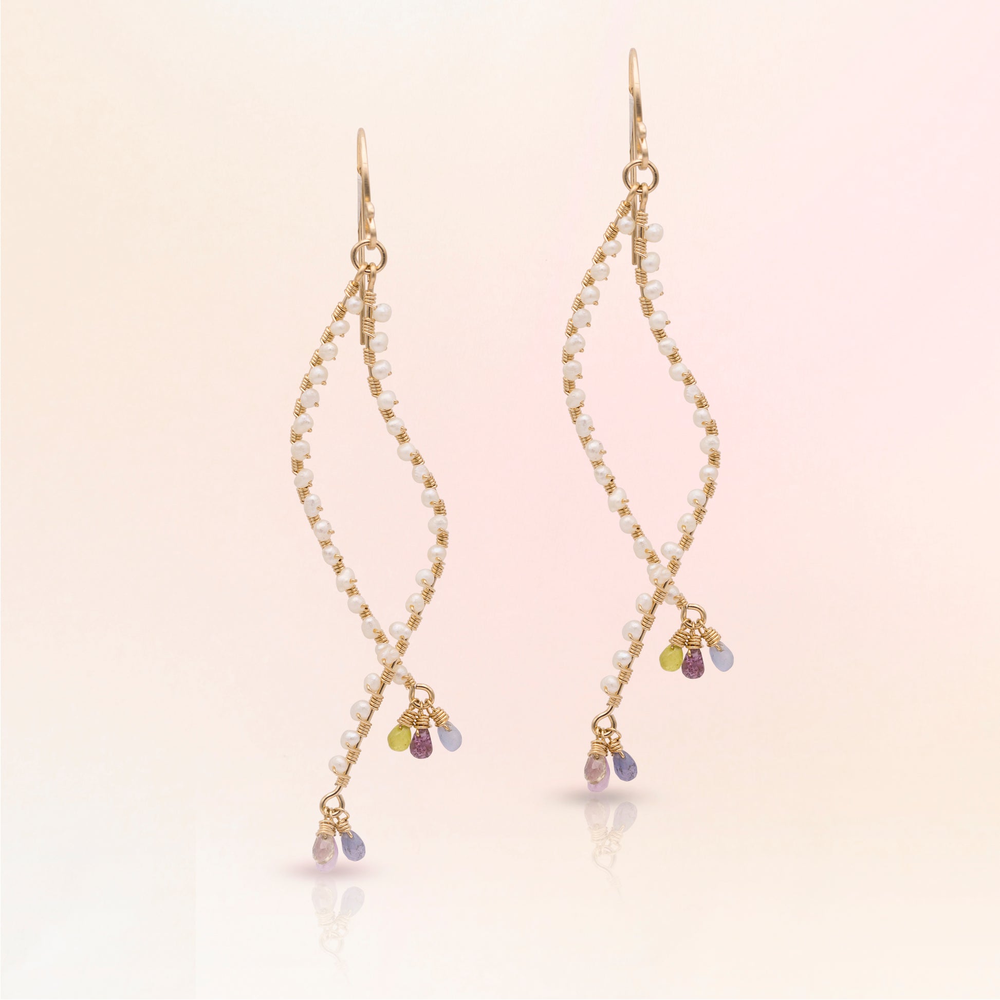 Handmade with 14k gold filled wire and faceted multi-color sapphire drops, these vine earrings are perfect for those who love statement jewelry. Elegant earrings with wire wrapped pearls, with each strand swinging independently yet always settling back into the same position. 3.2 inches long.