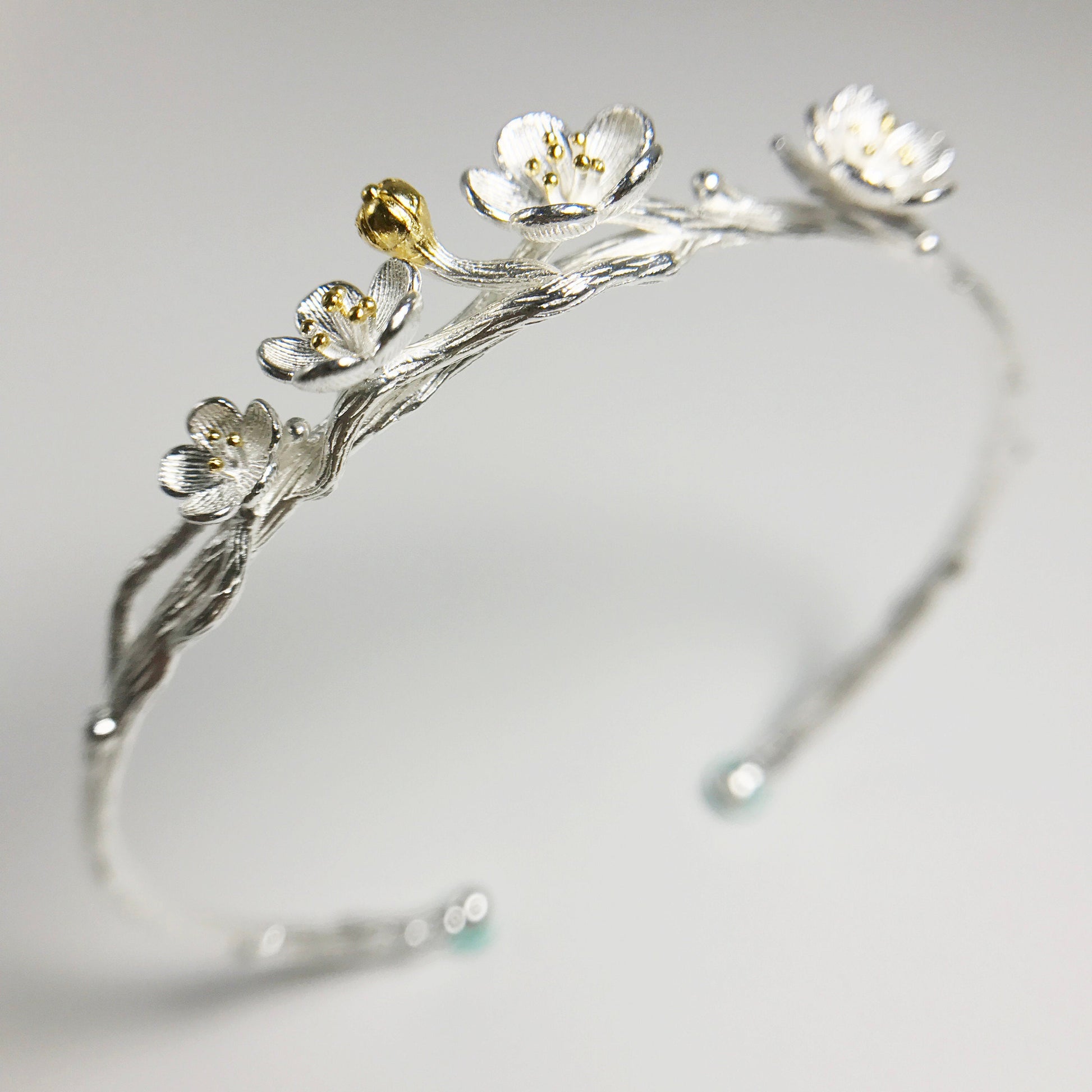 This adjustable sterling silver bracelet resembles a branch from a cherry tree, complete with cherry blossoms and a single 24k gold vermeil flower bud. Perfect for those that love nature jewelry.