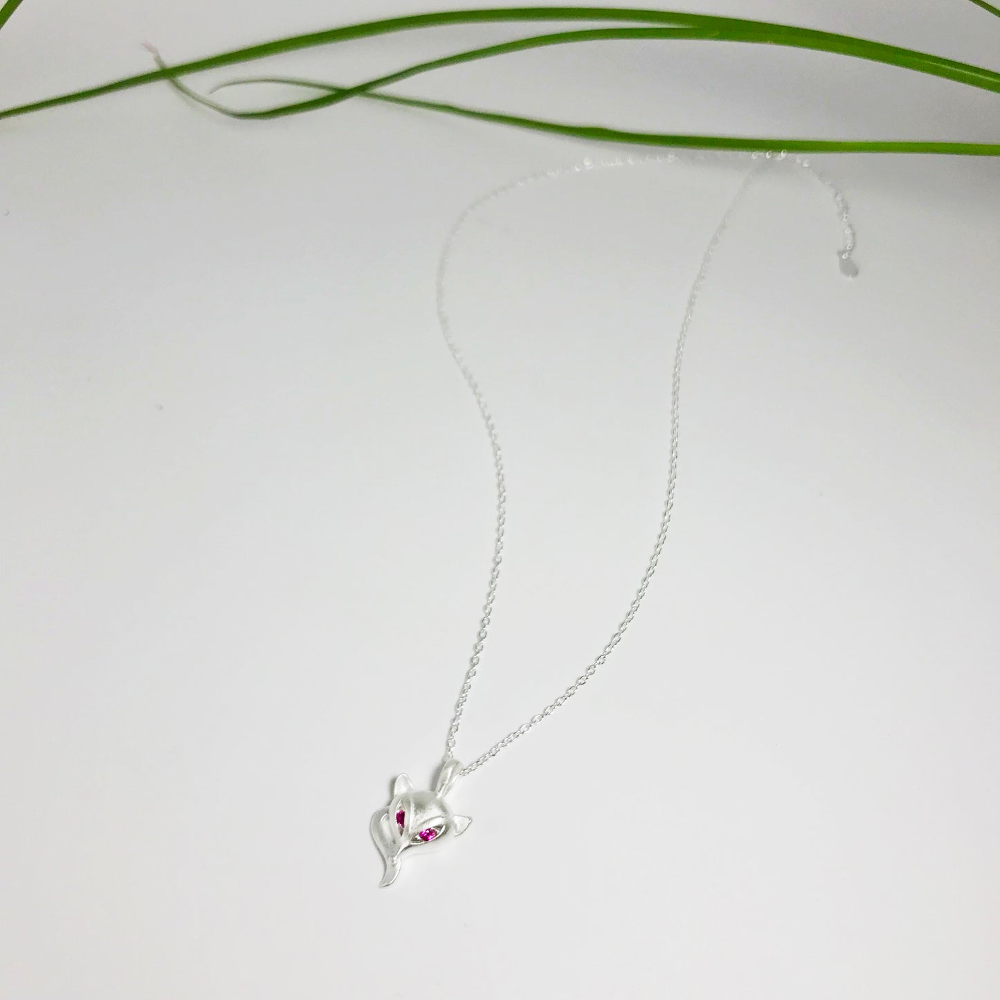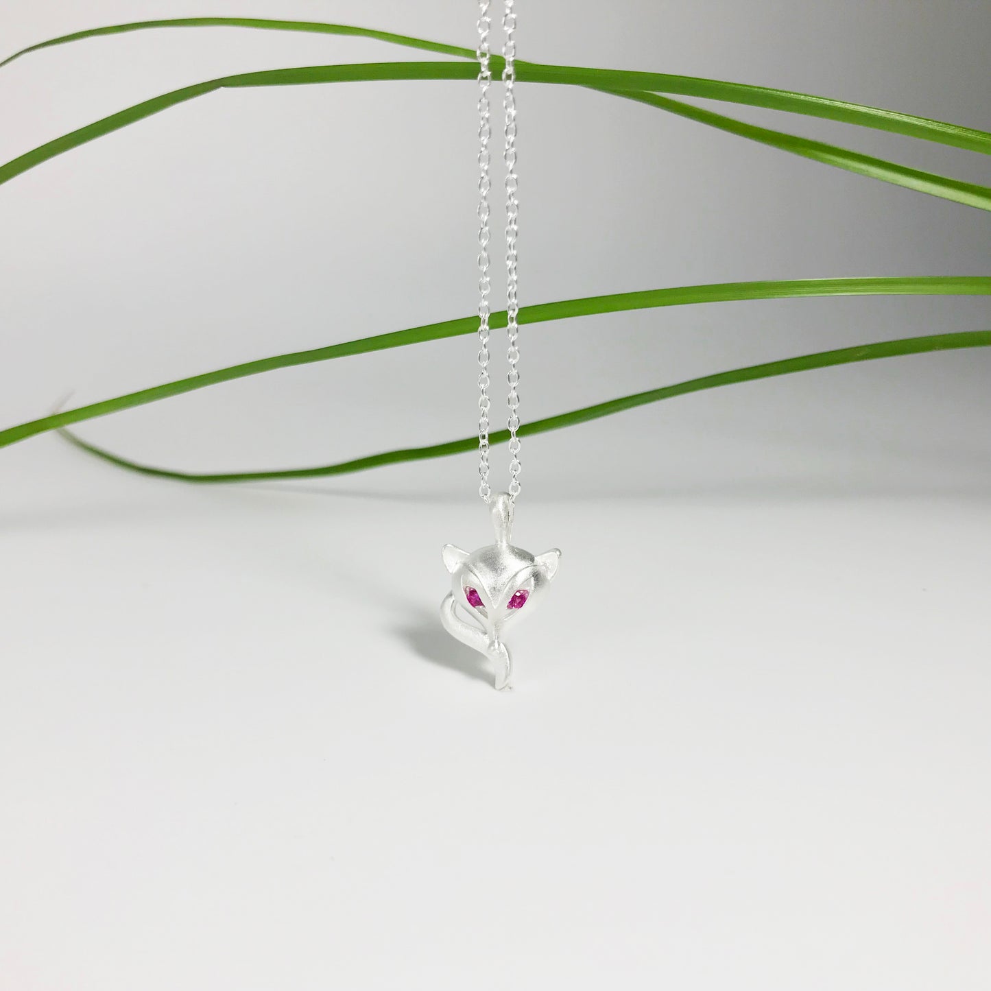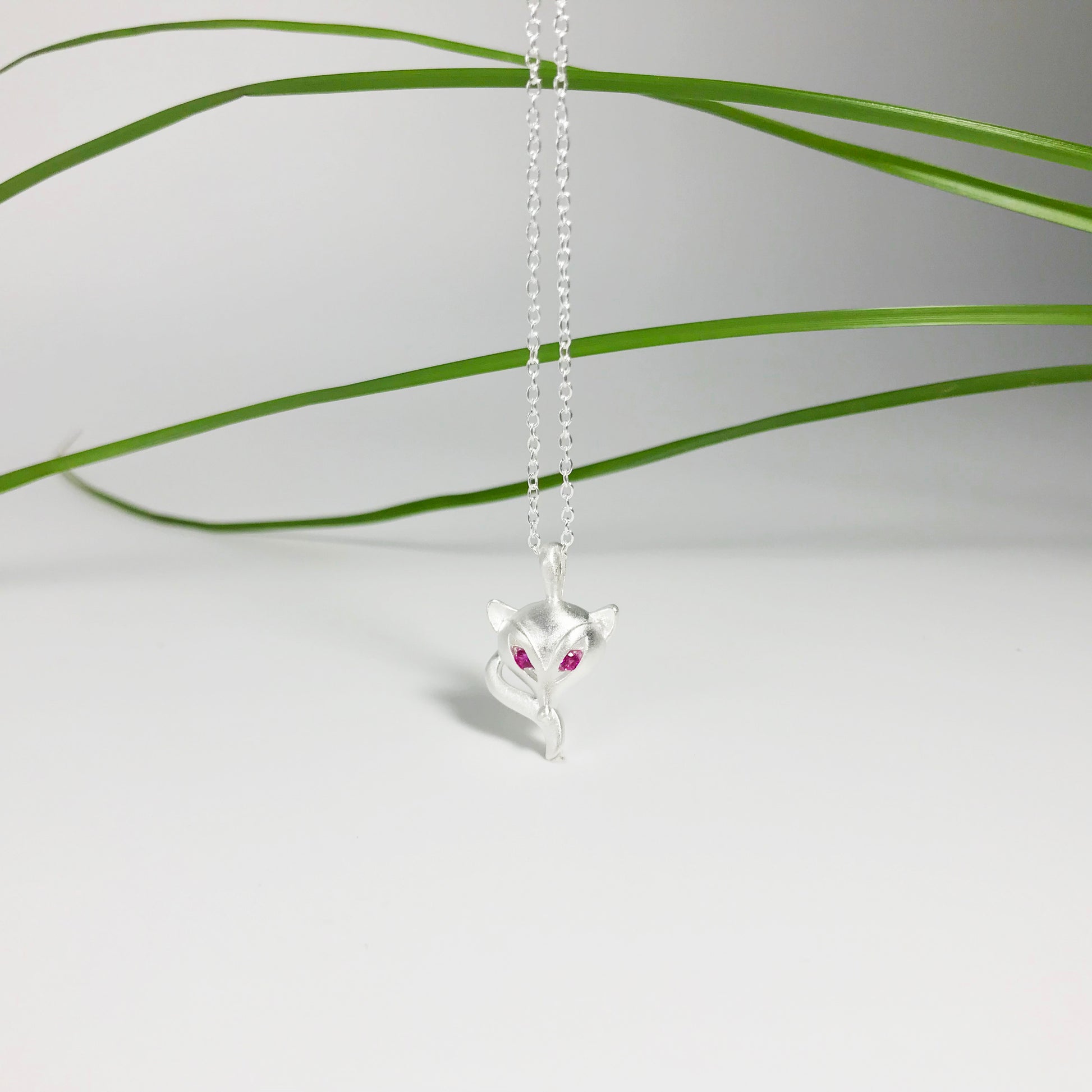 A silver fox pendant stares boldly with pink tourmaline eyes. Perfect for those that love nature jewelry. Adjustable necklace between 16" and 17".