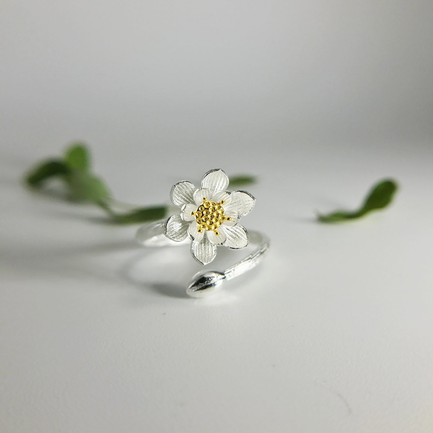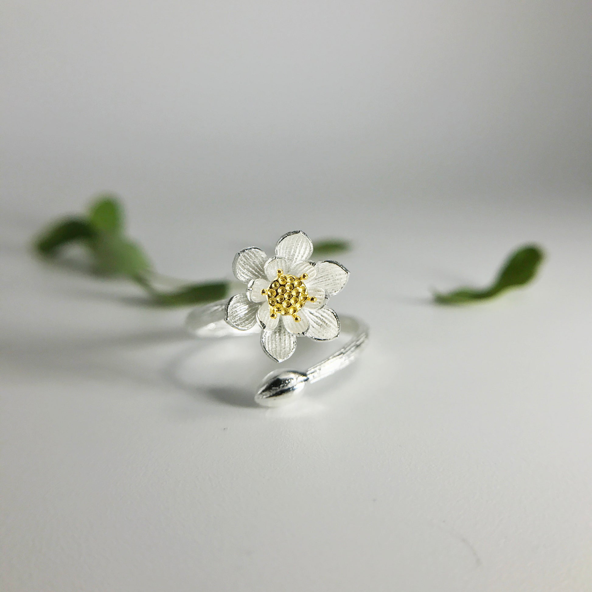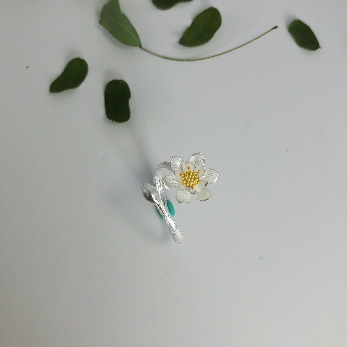 This adjustable sterling silver ring resembles a large lotus, with a gold centered blossom on one end and a flower bud on the other end. This is a popular ring and is part of a full set containing a necklace (SNE1000), bracelet (SBR1005) and earrings (SEA1008).